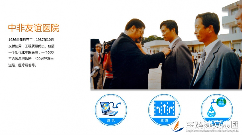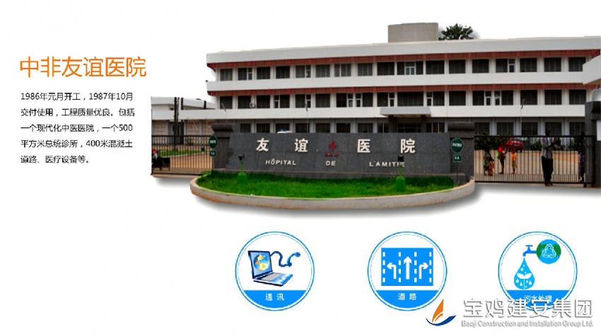 Constructed by Construction & Installation Group, The As key project, the China-Africa Friendship Hospital is 14000m2 in gross building area, and is awarded by the highest award of the Central African Republic with its excellent and high project quality, scientific and complete rod, communication, sewage treatment and other matched facilities. Foreign-related operation: from 1981 to the present, Construction & Installation Group leaves its footprints in dozens of countries including President Kolingba attended the ground-breaking ceremony of Central Africa Friendship Hospital |