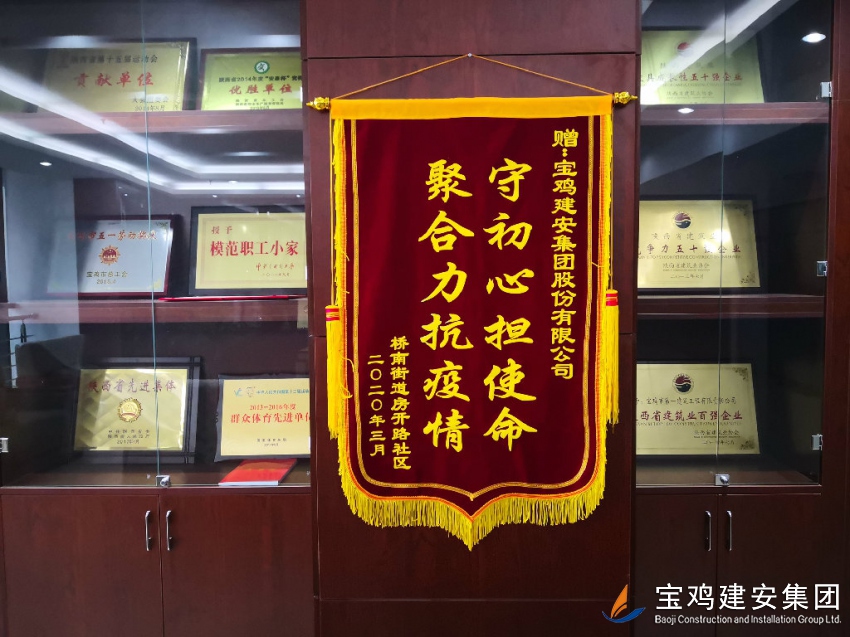 4月1日上午,寶雞建安大廈21樓舉行了一場簡單而熱烈的贈旗活動。橋南街道辦事處房開路社區(qū)馮書記、王主任等三人代表社區(qū)所管轄的廣大居民,給寶雞建安集團股份有限公司送來一面“守初心擔使命、聚合力抗疫情”的錦旗,贊揚寶雞建安集團公司在新冠肺炎疫情防控工作中對社區(qū)工作的支持和幫助。公司黨委書記、總經(jīng)理、工會主席等參加活動。