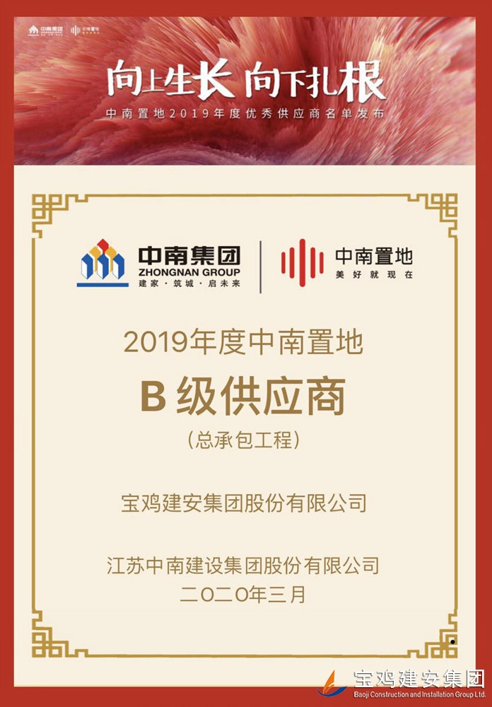 “中南置地2019年度優(yōu)秀供應(yīng)商”由中南置地設(shè)立,從全國100座城市360個標桿項目中選出,A級供應(yīng)商8家,B級供應(yīng)商36家。寶雞建安集團股份有限公司在360個標桿項目中脫穎而出,成為陜西省唯一一家B級供應(yīng)商。