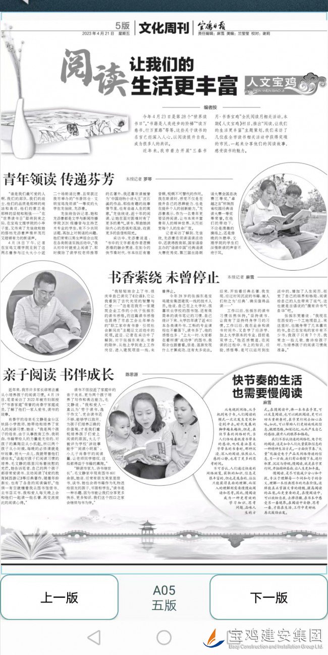 編者按:在第28個世界讀書日到來之際,《寶雞日報》社策劃了讀書專版,鑒于寶雞建安集團工會長期堅持舉辦的“書香企業(yè)”征文活動在社會的影響力與美譽度,記者來電提出采訪意向,公司工會極力舉薦了來自基層一線熱愛閱讀并多次參與讀書征文的技術人員張振東同志。5月21日,《寶雞日報》發(fā)表了這篇小專訪,現(xiàn)予轉(zhuǎn)發(fā)。